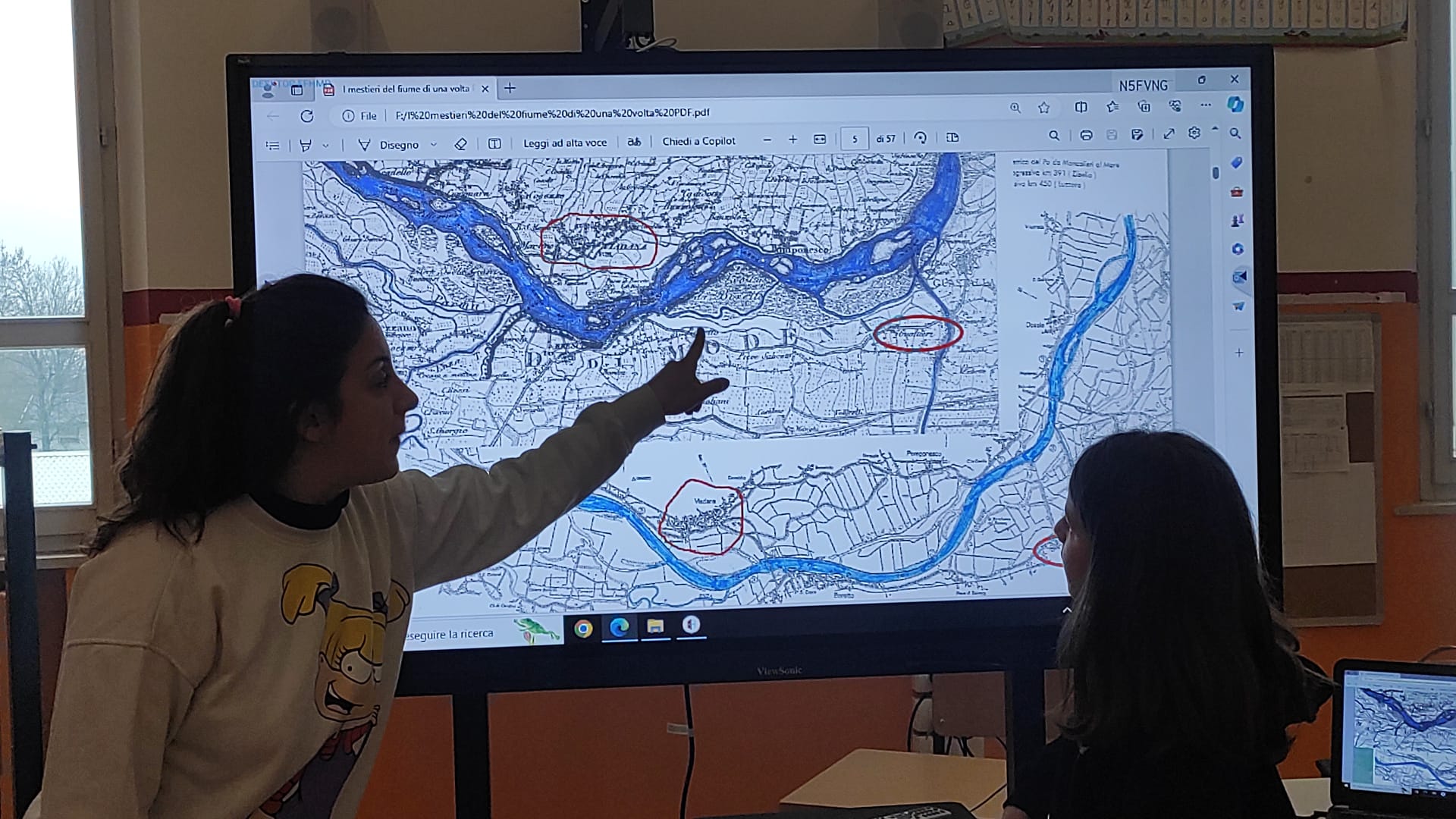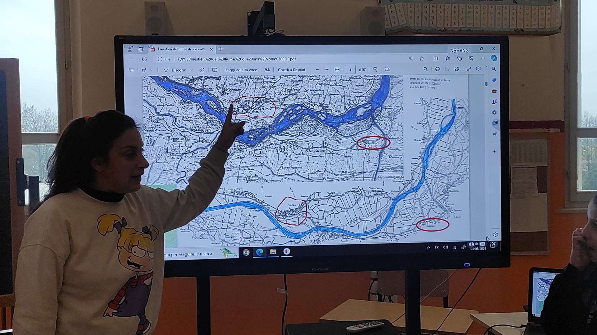 La lezione si è tenuta in aula e si è sviluppato l'argomento: il fiume come risorsa, non solo di cibo ed energia, ma anche di opportunità di lavoro e sostentamento per le persone e le famiglie che lo abitavano.